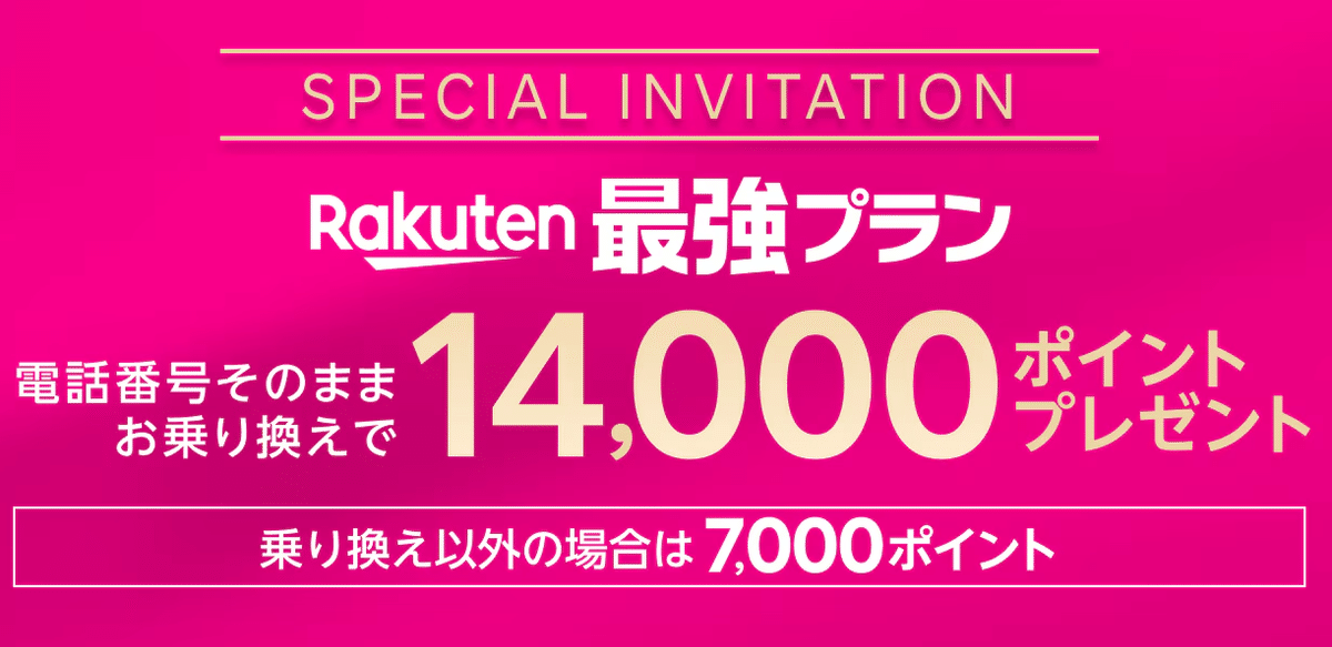 下記リンクから楽天モバイルをお申し込みいただくと電話番号乗り換え(MNP)で14,000ポイント、新規契約で7,000ポイントゲットできます